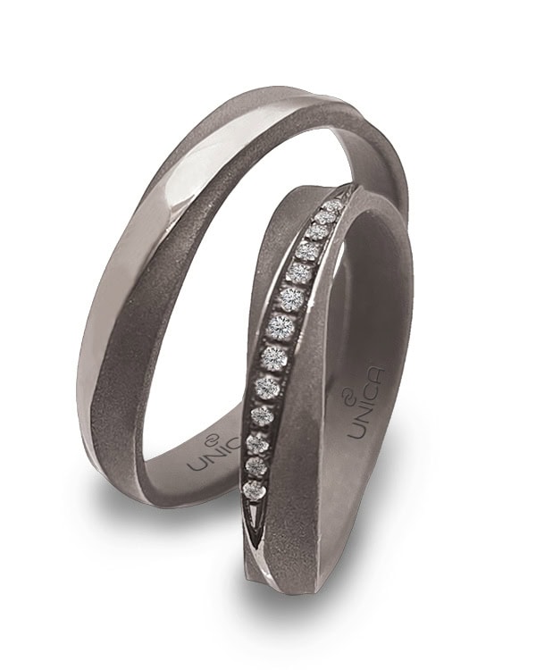 Fedi in titanio dalla forma morbida e sinuosa, leggermente ondulata, sabbiate con parti in rilievo lucide.