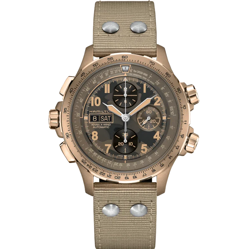 Progettato pensando ai piloti e costruito per le avventure in cielo, il Khaki Aviation X-Wind Automatic Chronograph vola attraverso i venti trasversali in una nuova veste audace, con motivi mimetici e nuove varianti di colore per quadrante, cinturino e cassa. Dotato di lunetta girevole interna e spirale in silicio anti-magnetica, questo modello ad elevate prestazioni mostra uno stile deciso e moderno.