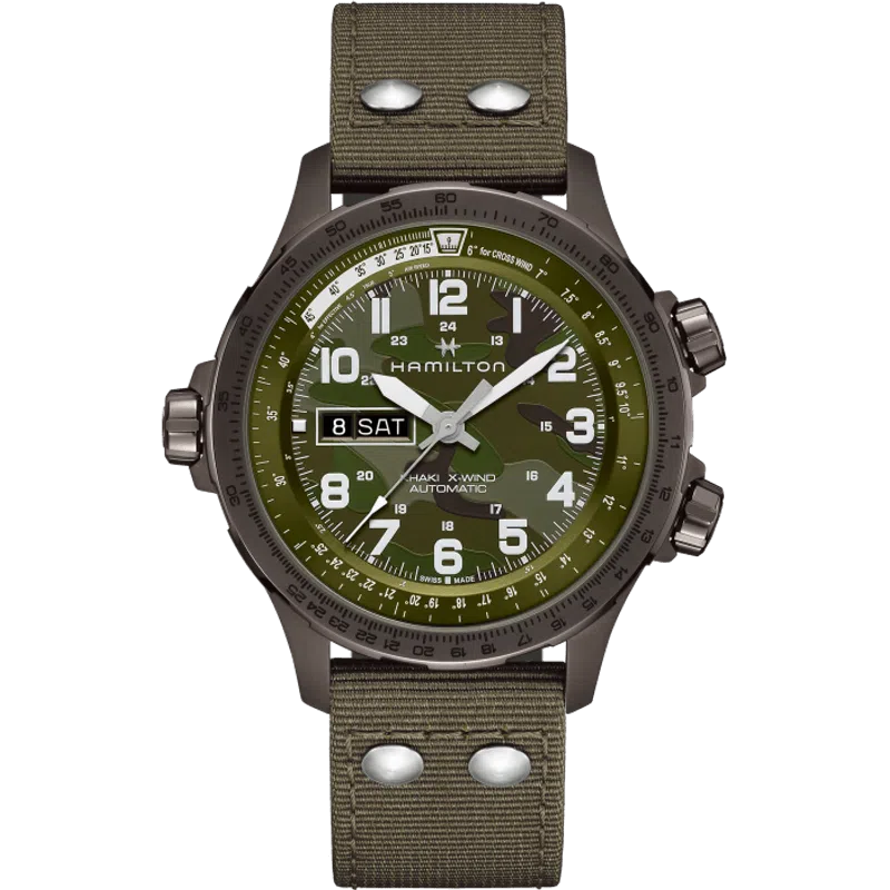 Progettato pensando ai piloti e costruito per le avventure in cielo, il Khaki Aviation X-Wind Day Date Automatic vola attraverso i venti trasversali con un nuovo quadrante con motivo mimetico abbinato ad una cassa marrone con rivestimento in PVD e cinturino in tessuto verde. Dotato di lunetta girevole interna e datario a ore 9, questo modello ad elevate prestazioni mostra uno stile deciso e moderno.