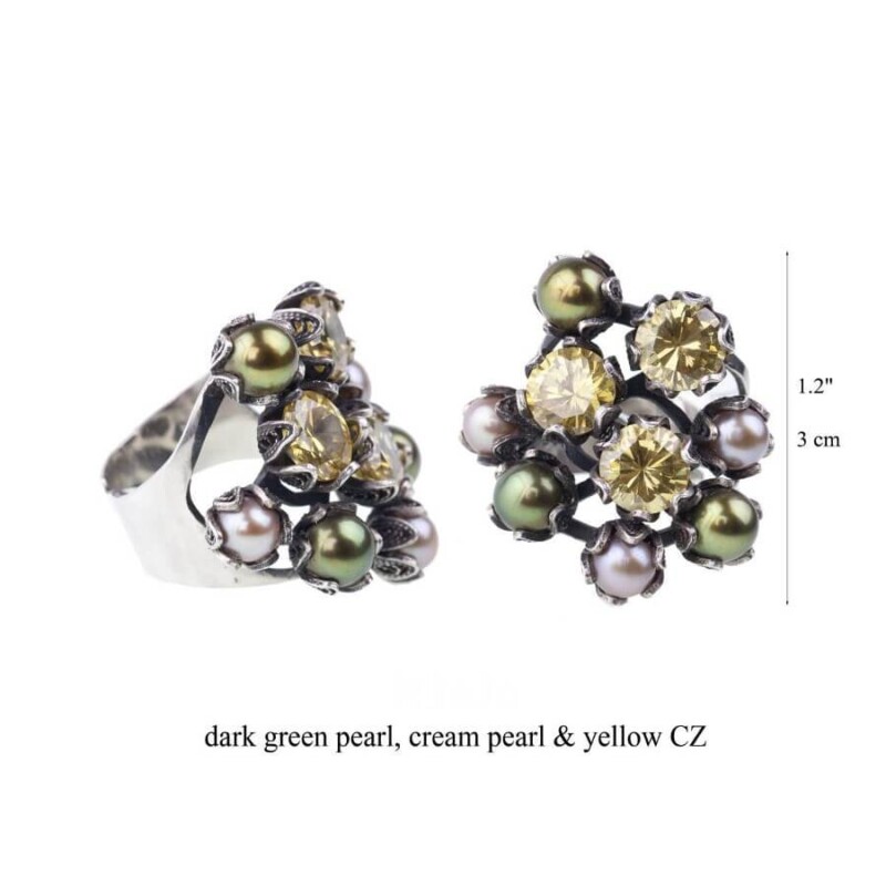 Anello in argento 925,con ortensie che accolgono perle e zirconi formando un bouchet. Un mazzo di fiori Yvone Chrisa direttamente da New York.
