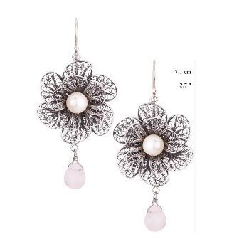 Orecchini della linea Yvone Crista lavorati in filigrana e con attacco a monachella. Fiore interamente in argento 925 con perla centrale.