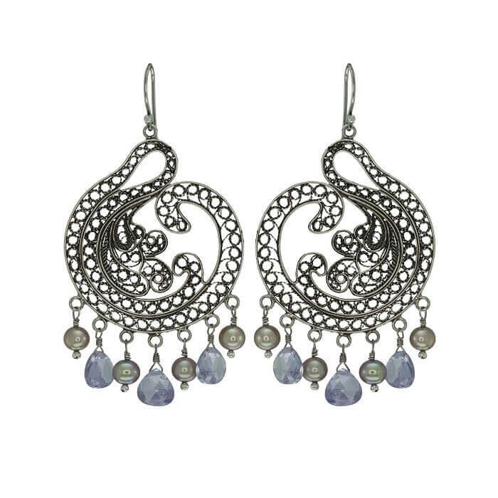 Bellissimi orecchini in filigrana artigianale con zirconi bianchi triangolari taglio briolè e perle color crema