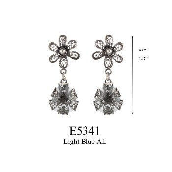 Nuovo orecchino per la collezione Yvonne Christa. La forma leggermente pendente è composta da fiore in filigrana e pendente a forma di goccia con pietra lemuria azzurro chiaro. Possibili varianti di colore per la pietra lemuria previa ordinazione.