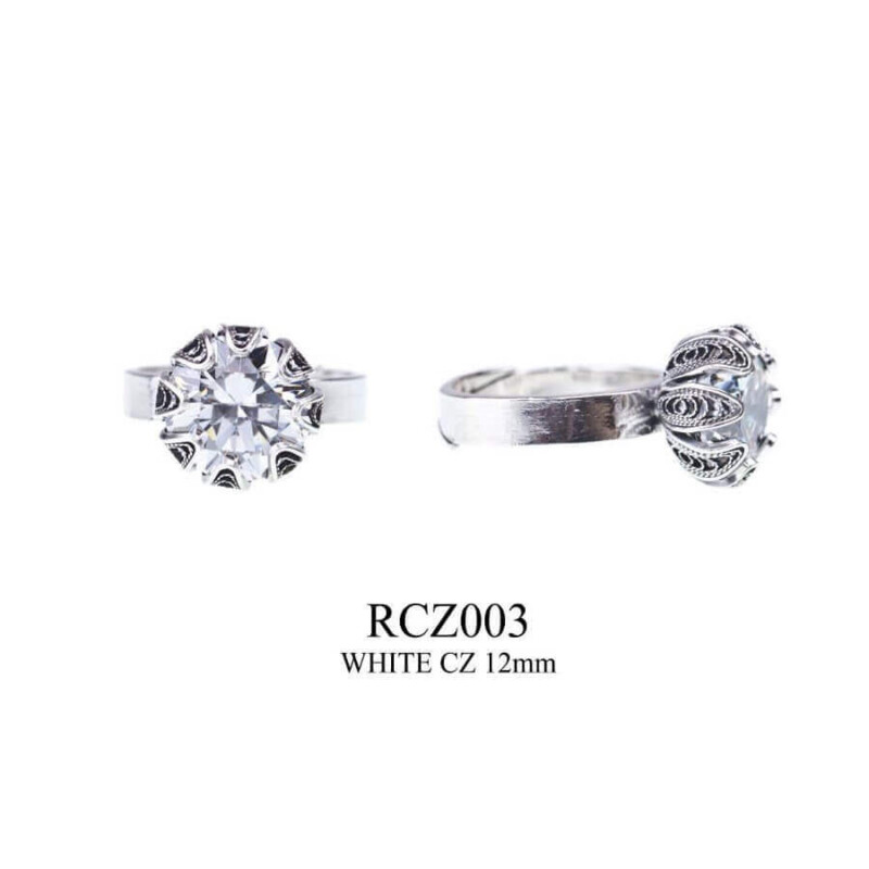 Classico solitario di Yvonne Christa con zircone bianco da mm12 su cestino tulip in filigrana.