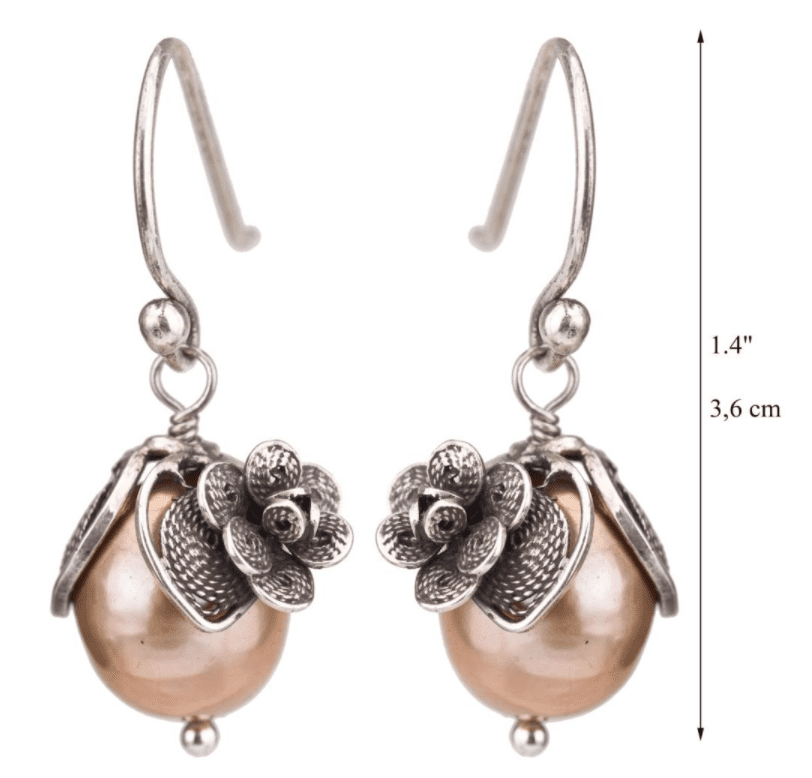 Orecchini pendenti realizzati in argento con il metodo della filigrana, piccole rose artigianali sulla sommità delle perle perle bianche.